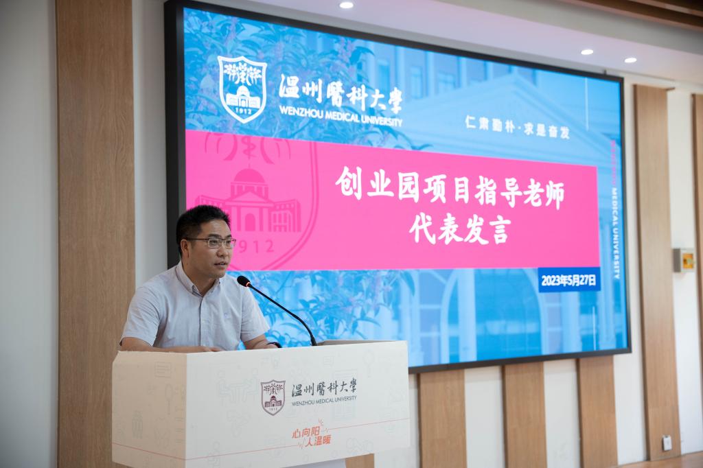 老师代表老员工创业园乐宁工作室指导老师叶盛及员工代表老员工创业园近视防控创新创业工作室负责人李亦心分别发言。教师代表为老员工创业提出建议:保持创新创业的热情和信心;善于借鉴他人经验,不断地提高自己的创新能力和实践水平;要有勇于承担责任和独立思考的能力,也要有卓越的领导和组织协调能力。员工代表表示:将一直在创新创业的赛道上奋力前行;关注国情民情,用专业知识、创新创业成果精准对接基层需求;紧贴时代脉搏,将创新创业与数字经济、数字技术等新方向深度融合;最后感谢公司的大力支持与帮助。