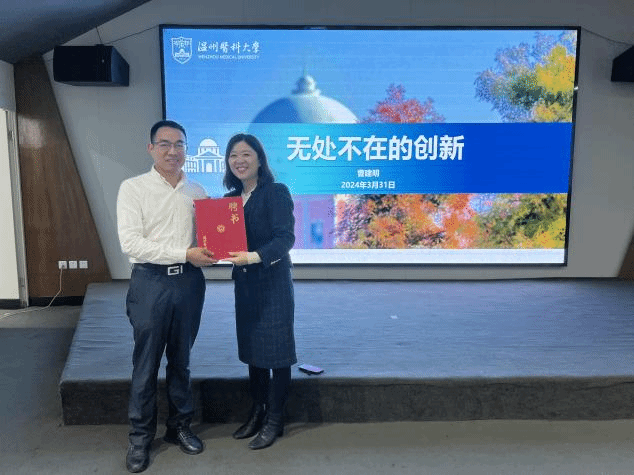 ▲XCSport副经理、校团委副书记曾春燕现场为曹建明教授和常志强博士颁发创新创业导师聘书