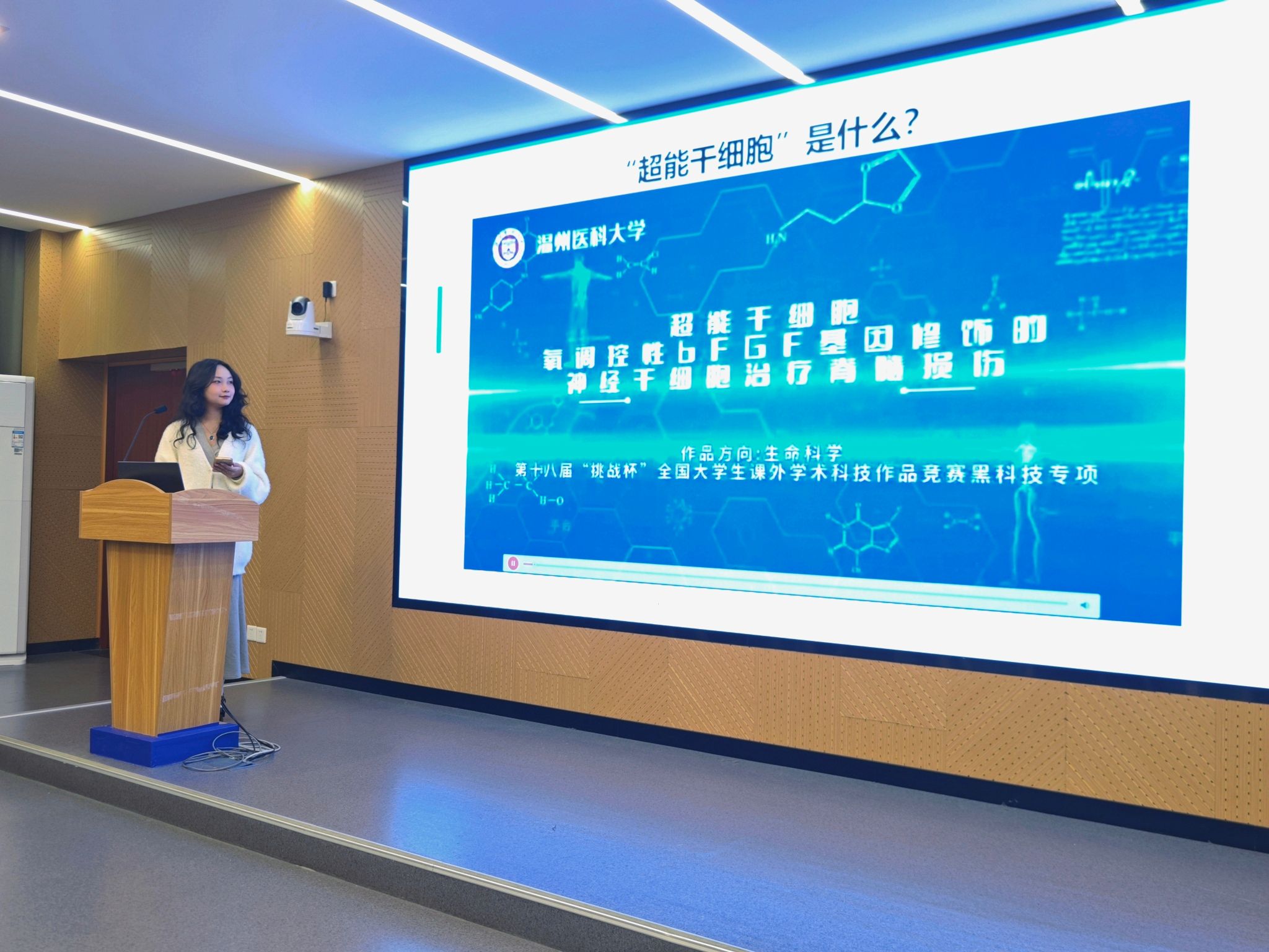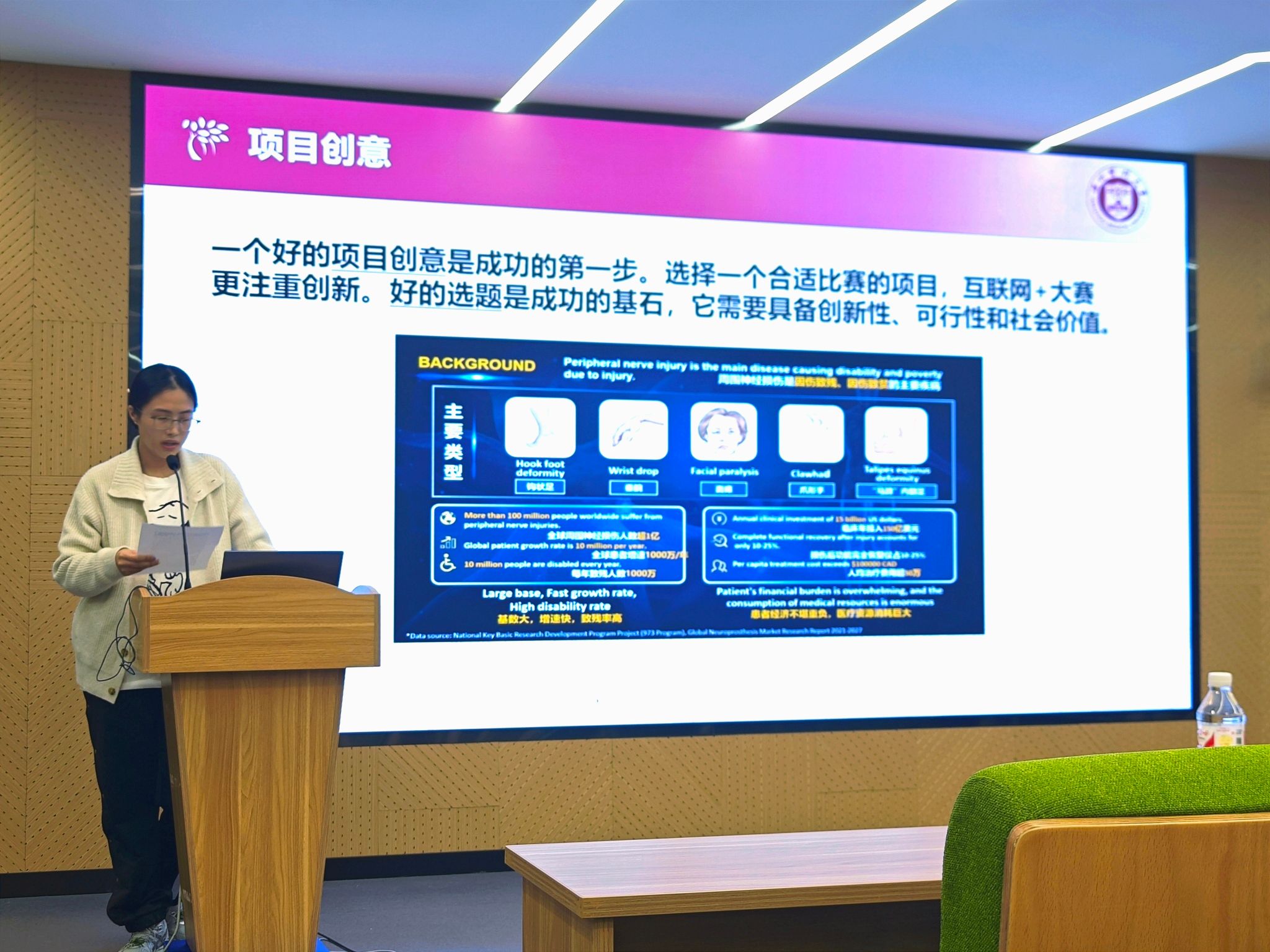 活动的第一议程精彩纷呈,分别进行了获奖团队交流分享与备赛经验交流分享。2024年大学国际老员工创新大赛老员工主赛道金奖项目《髓心所欲--精准修复神经损伤治疗瘫痪的开创者》负责人王韵扬同学,细致地分享了一路走来的备赛经验,并在现场展示项目路演部分环节。现场师生纷纷拿起手机进行拍照记录。国际赛道金奖项目团队代表胡馨匀同学也分享了国际赛道的备赛经验,以团队的成功经历提高同学们创新创业的信心、决心。