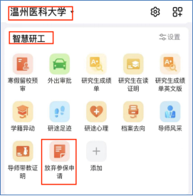 已参加城乡居民基本医疗保险、新型农村合作医疗保险等(简称农保),父母子女统筹医疗保险等的员工,通过钉钉工作台提交放弃参保申请(如图1)。(审核路径:员工申请(上传查询界面,如图2)→辅导员审核→研究生院审核)