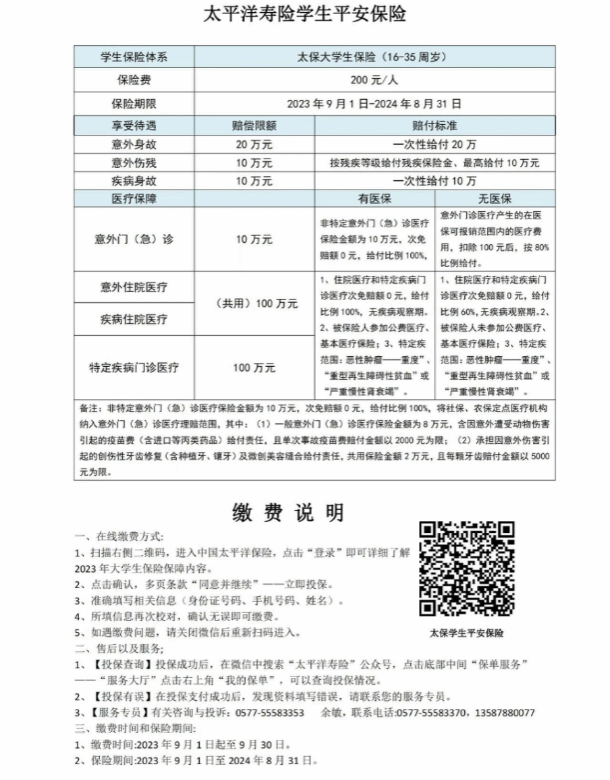 3、做好员工政策咨询答复工作。请各公司辅导员了解老员工医保险和学平险基本政策内容。寿保保险公司服务专员:叶育(手机号:13587890917),太保保险公司服务专员:余敏(联系电话:0577-55583370,13587880077),将协助各位老师做好员工咨询答复。